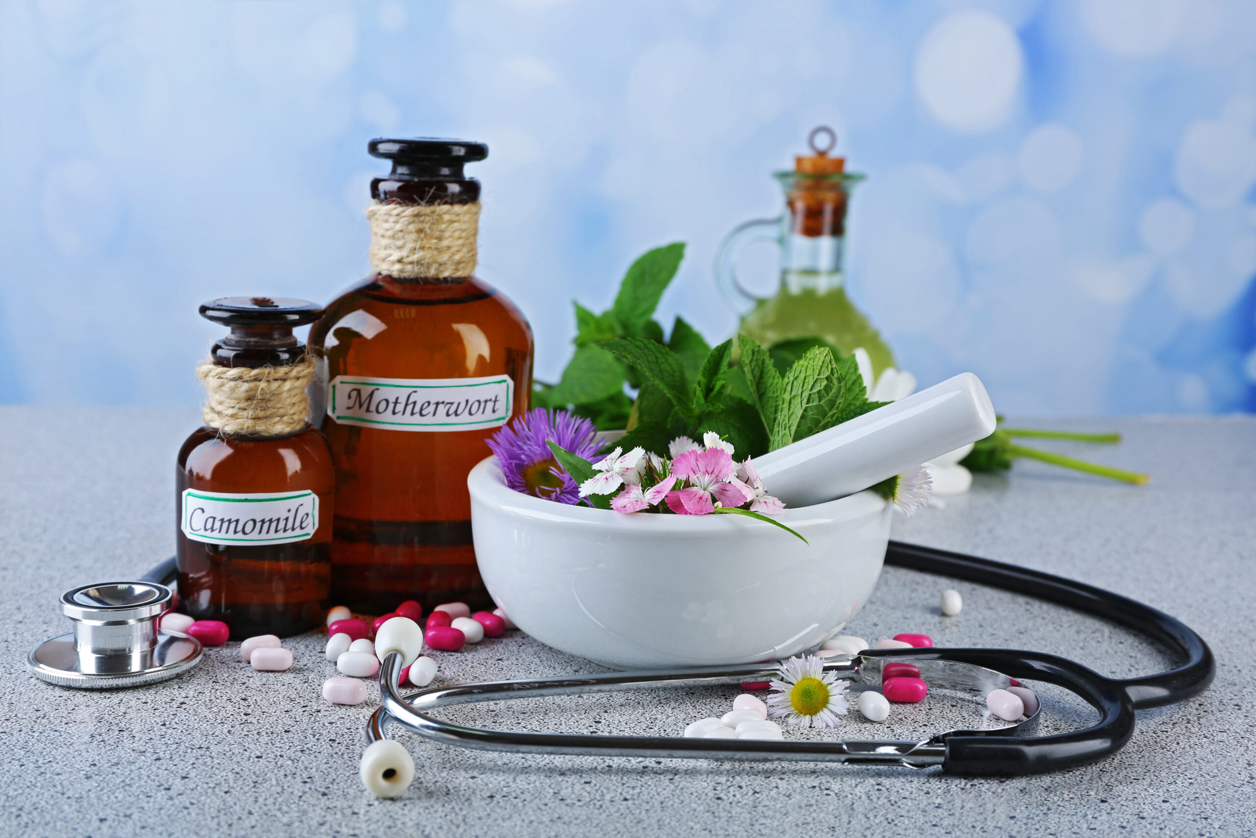 Alternative medicine herbs and stethoscope on wooden table, on light background